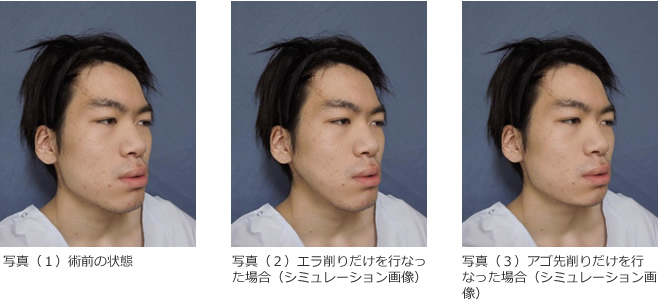 顔面輪郭形成手術において大切なことはトータルバランスです。特に下顎の場合、エラから顎(アゴ、あご)先まで、どの部分をどの程度削れば良いのかを、術前にしっかりと把握しておく必要があります。たとえば写真(1)の患者さまのように下顎全体が大きい人がエラの部分だけを削ってしまうと、写真(2)のように顎(アゴ、あご)先が大きく見えてしまいます。