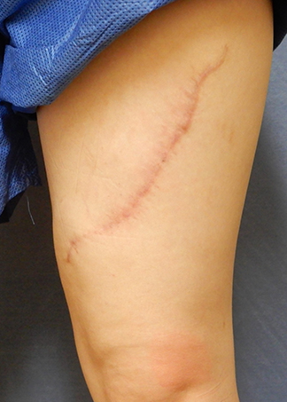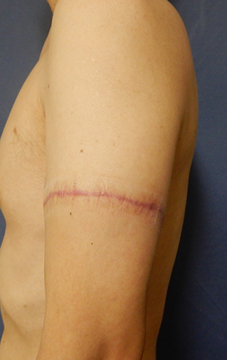 | 傷跡 | タトゥー(入れ墨・刺青)除去をした部位に、キズ跡が残ります。手術後3~6ヵ月程度キズの赤味が強い時期がありますが、その後は白くなって目立たなくなります。キズ跡を目立たなくするために、ご状態に合わせて、テーピングや内服薬などの術後処置を行ないます。 |