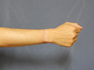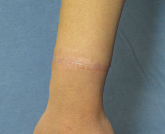 | 傷跡 | タトゥー(入れ墨・刺青)除去をした部位に、キズ跡が残ります。手術後3~6ヵ月程度キズの赤味が強い時期がありますが、その後は白くなって目立たなくなります。キズ跡を目立たなくするために、ご状態に合わせて、テーピングや内服薬などの術後処置を行ないます。 |